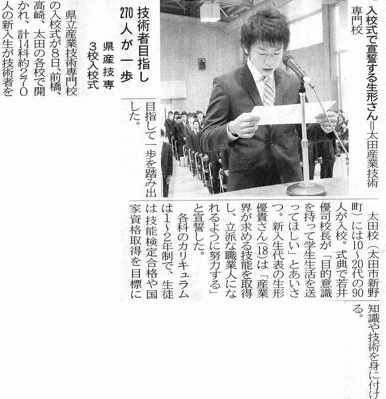 去る4月8日、平成26年度入校式が行われ、多くの来賓の方々や保護者の方々に祝福される中、機械技術科15名、電気技術科20名、自動車整備科21名、CADシステム科17名、溶接科17名の計90名の学生が新たに太田産業技術専門校に入校しました。入校生代表のCADシステム科生形君は、「産業界が求める技能を取得し、立派な職業人になれるよう努めたい」と宣誓。専門校の学生として所信を伝えました。