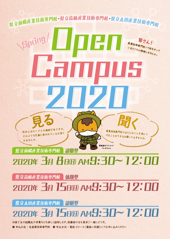 群馬県内の産業技術専門校(前橋・高崎・太田)にて春のオープンキャンパスを開催します。