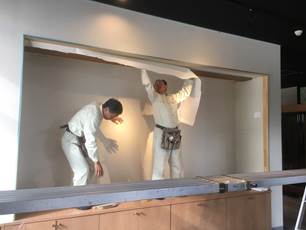 久保田さんには、なかなかうまくいかないケースや、難しい施工の話がたびたび舞い込むが、これまで培った経験と知識をもとに、臨機応変に対応する。「内装仕上げの仕事は、素材やその建物の状況により、一つとして同じ仕事はない。好きでこの仕事をやっているので苦労はない。」と笑顔で話す。