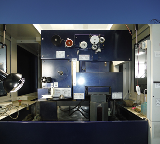 松井さんは、工業高校在学中に旋盤作業やフライス盤作業を学び、卒業後は金型製作に携わり、キヤノン電子(株)でも入社後金型製作部門を一筋に歩んできた。一眼レフカメラの絞りの口径精度アップと安定した回転を得るために使用する高精度歯車を、ワイヤ放電加工機とプログラミングを駆使して加工する。