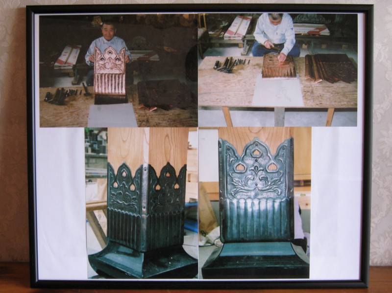 最近では彫刻師が少なくなっているため、掘ってもらった型板をジュラルミンとアルミで葺いて、末代まで残るようにしている。木は痩せるので、このような加工が必要だという。