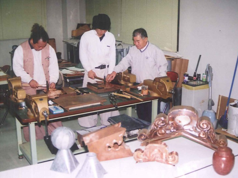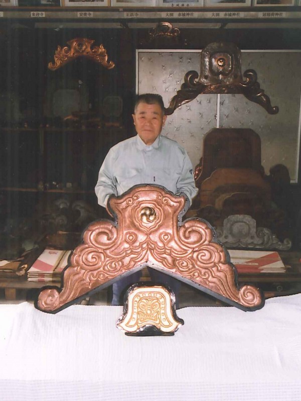 大規模屋根の銅板葺き施工、鬼板造りにおいて、自ら改良した道具を使用し、手作りで加工する技能に卓越しており、これまでに100件以上の寺社建築実績がある。