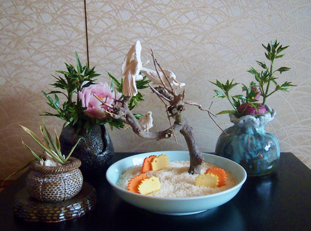 「最初の頃は型にはまって本物そっくりに剥いてしまう。しかし、それではただの牡丹の花でしかない」。後藤さんは掻敷剥物を作る際、誰が見ても何か分かるように作るだけでなく、実物よりもオーバーな表現をしたり、わざと揃えないことで自然な表情を出すことを心掛けている。「それには経験と愛情が必要」。そう語る後藤さんだが、実は幼いころは製図士になりたかったという。