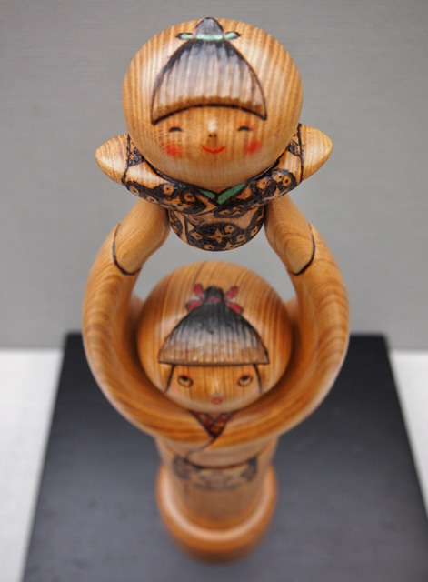 「これは『ばあちゃんと黒猫の玉』。昔の洋裁学校を出た厳しい人だったけど、今考えると本当に色々と教えてくれた。よく縁側に座って黒猫の玉を抱いていた」。創作こけし製作工・加藤龍雄さんが生み出す作品は、その一つ一つに独特の世界観がある。
